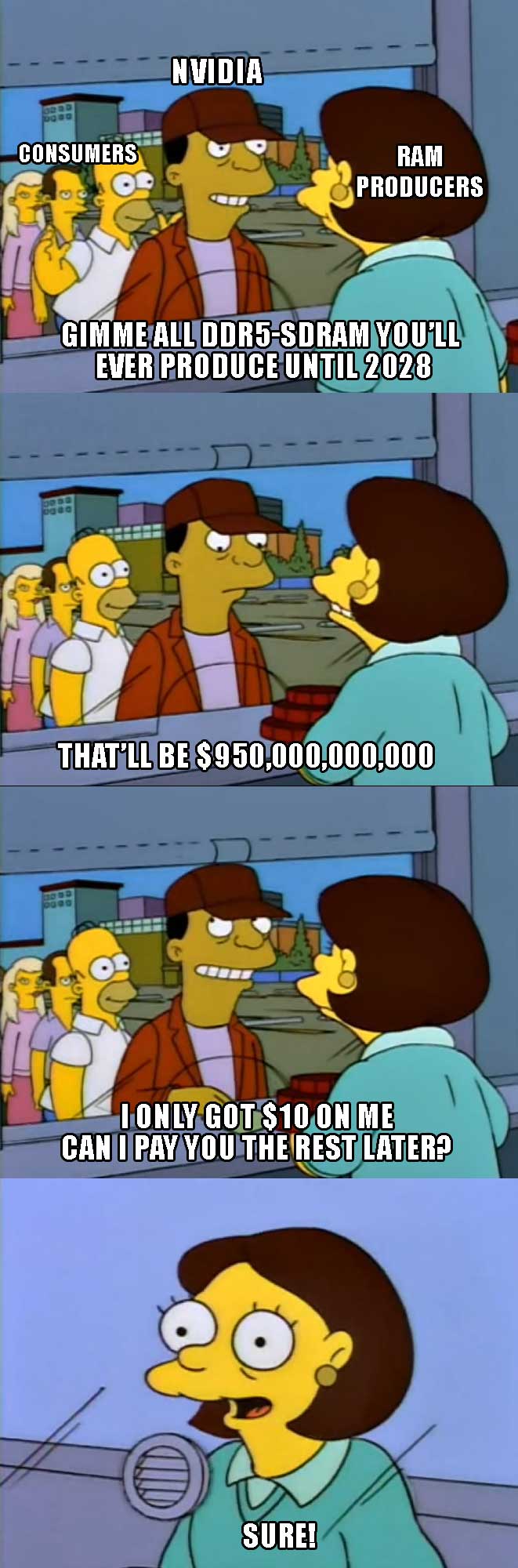 My good computer broke, the one I have is defective, and the worst I’ve ever had, maybe even worse than the windows vista desktop. Now I can’t buy a new one anytime soon, because of this stupid AI bubble. Nothing good will come out of this AI either, best case scenario they go bust and our tax dollars bail them out. Worst case they take all of our jobs and or use it to create a dystopian surveillance state with mandatory colonoscopies and court ordered president branded brain chips if you fall behind on your debts.