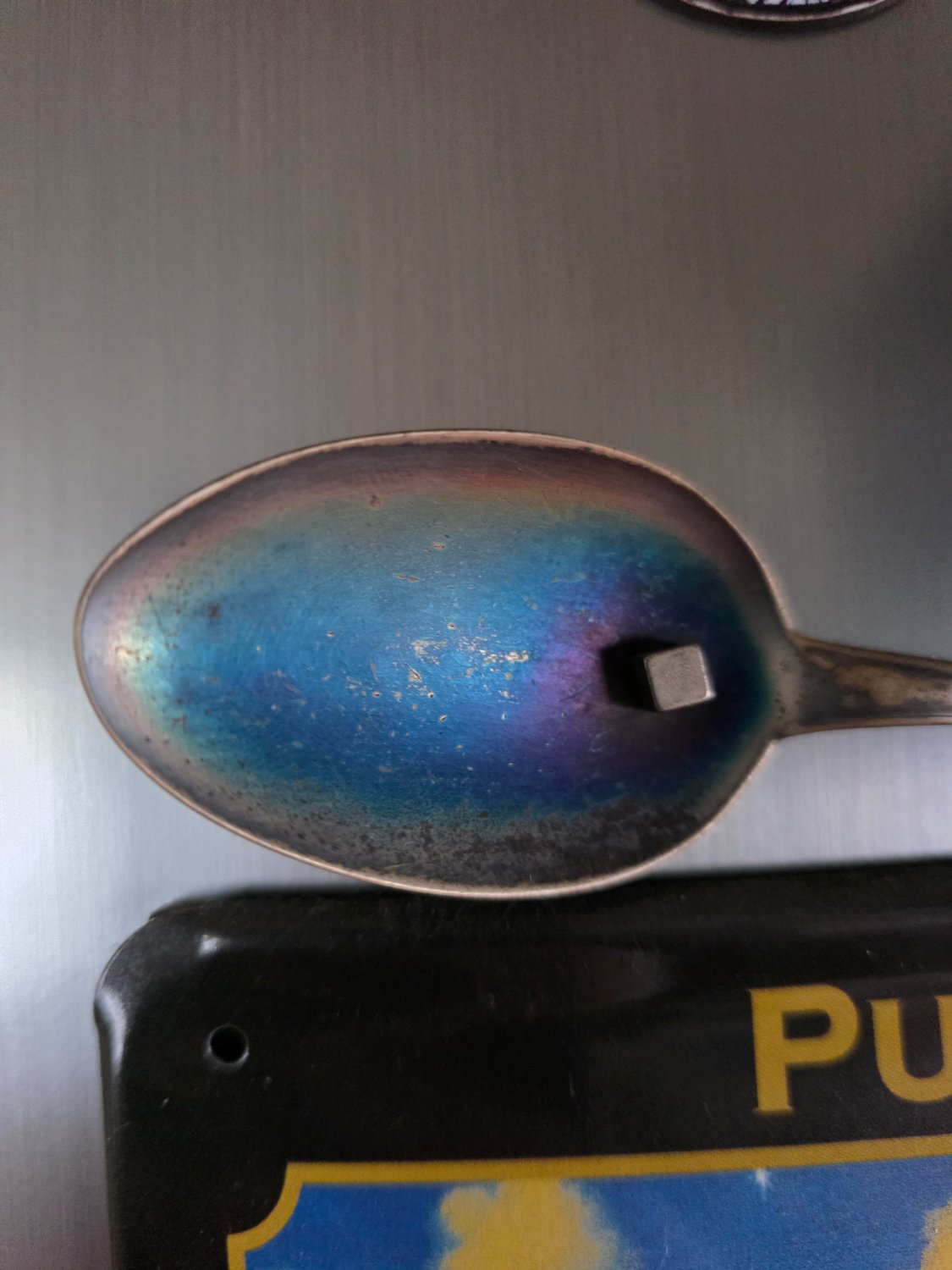 I have my late grandpa’s silver spoon attached to my fridge with a neodymium magnet. What kind of chemical reaction causes that discolouration?