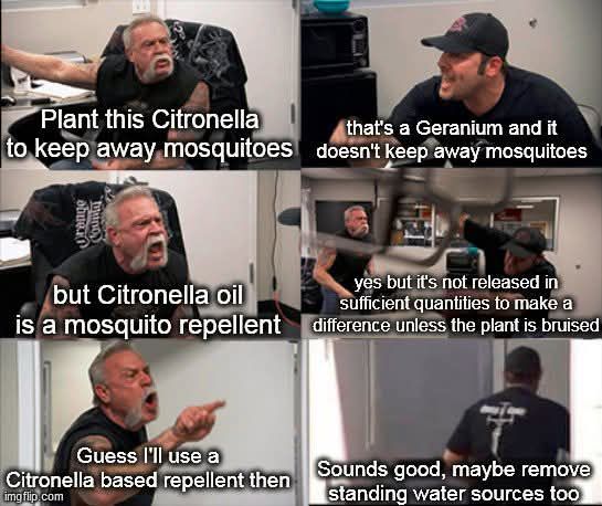 The “Citronella Scented Geraniums” never worked much at all to repel mosquitoes. It was essentially the placebo effect. I’ve done really lame and totally non-scientific experiments myself. The geraniums simply do not work to any significant benefit. People will literally argue with you day and night about this, but it’s just not true.