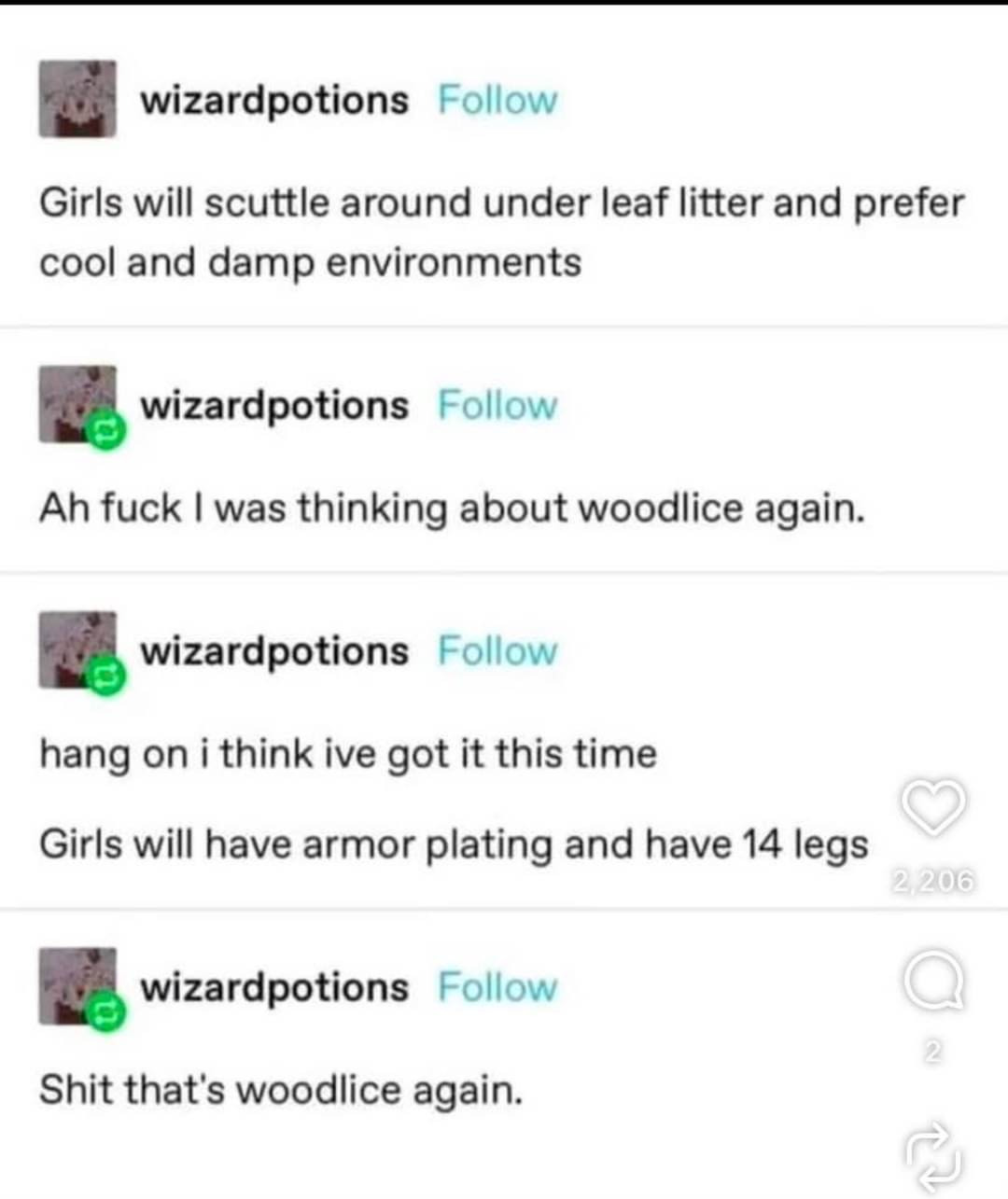 Fun fact: woodlice are terrestrial isopods, meaning they share a class (Malacostraca, the second-largest crustacean class after Insecta) with the decapods like crabs, shrimp, etc. Orders Isopoda and Decapoda are far away within the class, but they’re still in there!