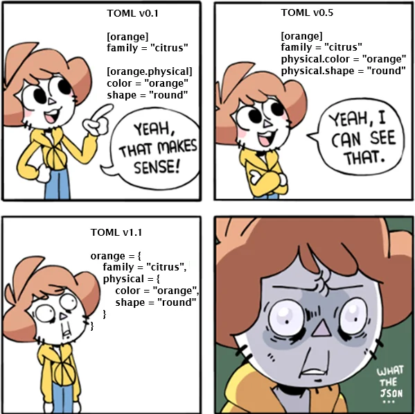 }or]can also be a disadvantage of JSON, since you cannot stream it, i.e. start processing the fields/elements before the whole thing has arrived. (You probably still don’t want to use TOML for that, though. JSONL, CSV or such are a better idea.)I’m only being pedantic. Toml is not bad. Yaml I personally don’t like because I don’t approve of semantically required whitespace but I know I’m in the minority there.