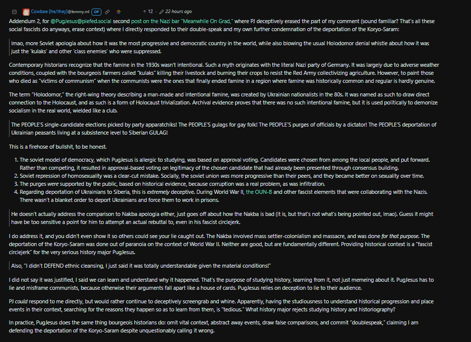 but cowbee also tends to just copypaste off the tankie bible, which is redsails. You can search his talking points and see how often he pastes the same things.