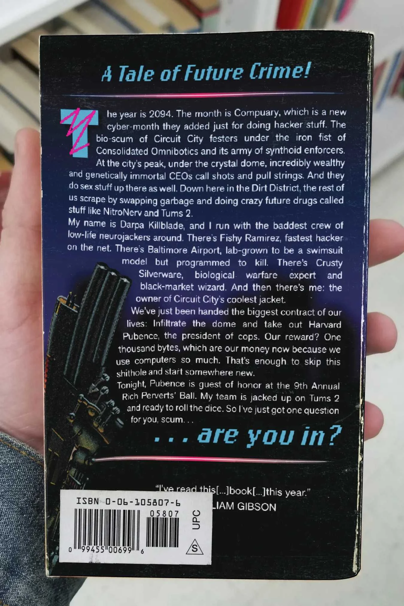 That ISBN does match, but I’ve just… obtained… Brute Orbits and it doesn’t seem like what’s described in the picture. It’s about futuristic prisons and seems to have little or no cyberpunk elements.