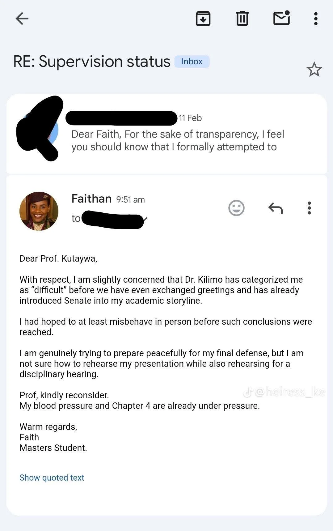 This is the first time we get a face to the name “Faith”. These emails are obviously jokes. That you’re spinning this into a race issue tells more about you than OP.