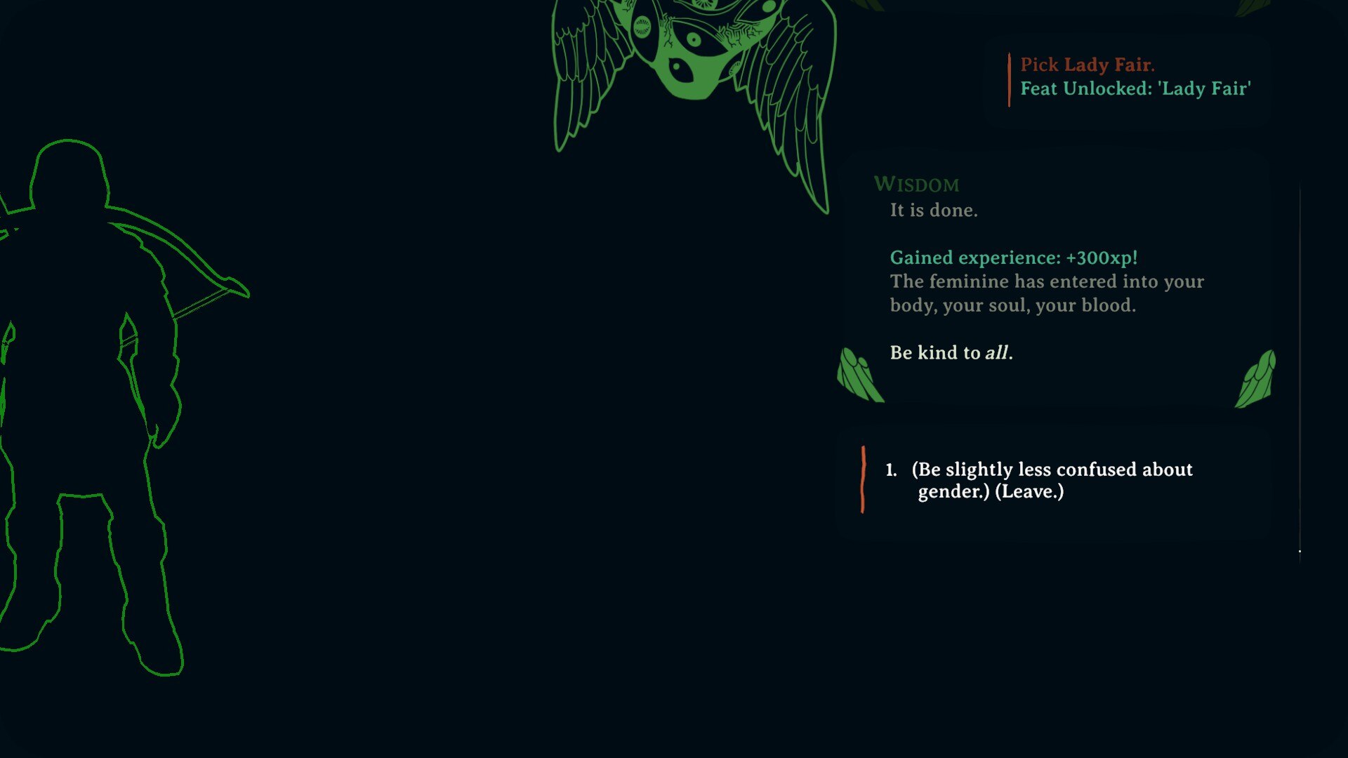 Esoteric Ebb has a quest reward that makes you slightly less confused about gender. The tl;dr version of that very long text is “Be kind to all”.