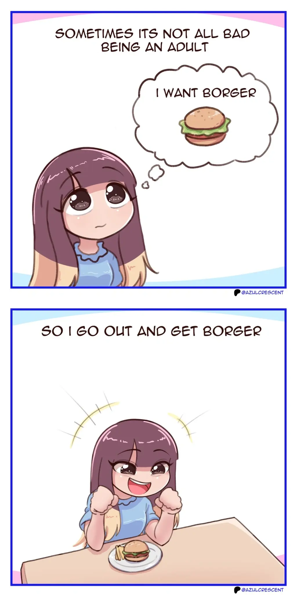 I want burger. I love burger. But I ate too many burgers. So then I got cancer.