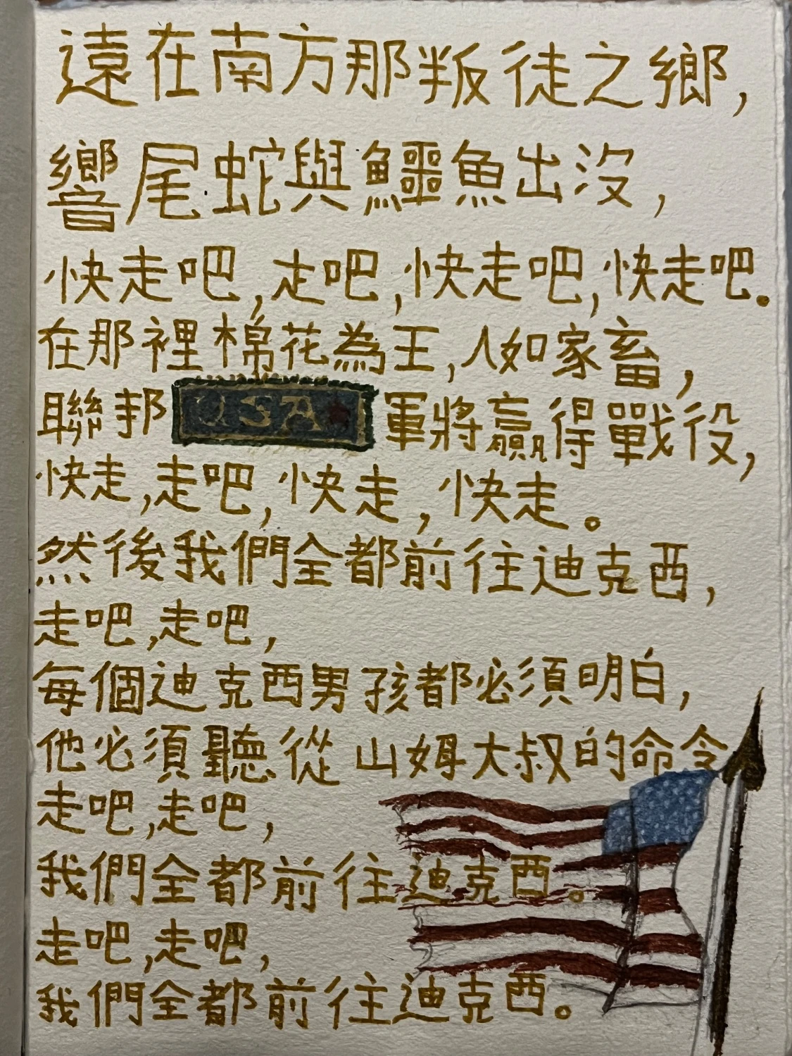 minus-squarerenzhexiangjiao@piefed.blahaj.zonelinkfedilinkEnglisharrow-up19·3 days agoI found this, it matches what’s in the post much better: Away down South in the land of traitors Rattlesnakes and alligators Right away (right away), come away (come away) Right away (right away), come away Where cotton’s king and men are chattels Union boys will win the battles Right away (right away), come away (come away) Right away (right away), come away We’ll all go down to Dixie, away, away Each Dixie boy must understand that he must mind his Uncle Sam Away (away), away (away) We’ll all go down to Dixie Away (away), away (away) We’ll all go down to Dixie