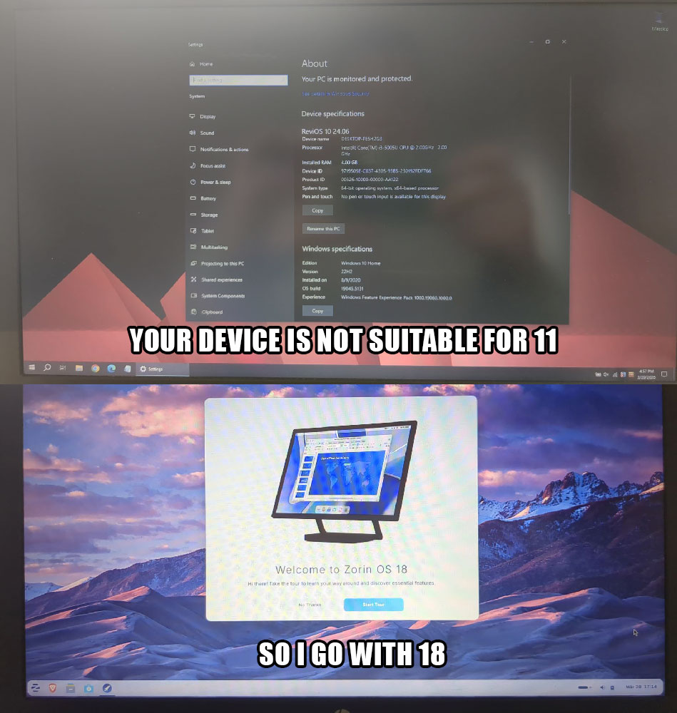 Old laptop got boosted. Wasn’t updated for 6 years. Microslop tried to install Win11, then said buy new hardware, then tried to install anyway. Didn’t worked. Zorin OS works great. Will also try out Lint Cinnamon, Cachy, Pop and some Arch.