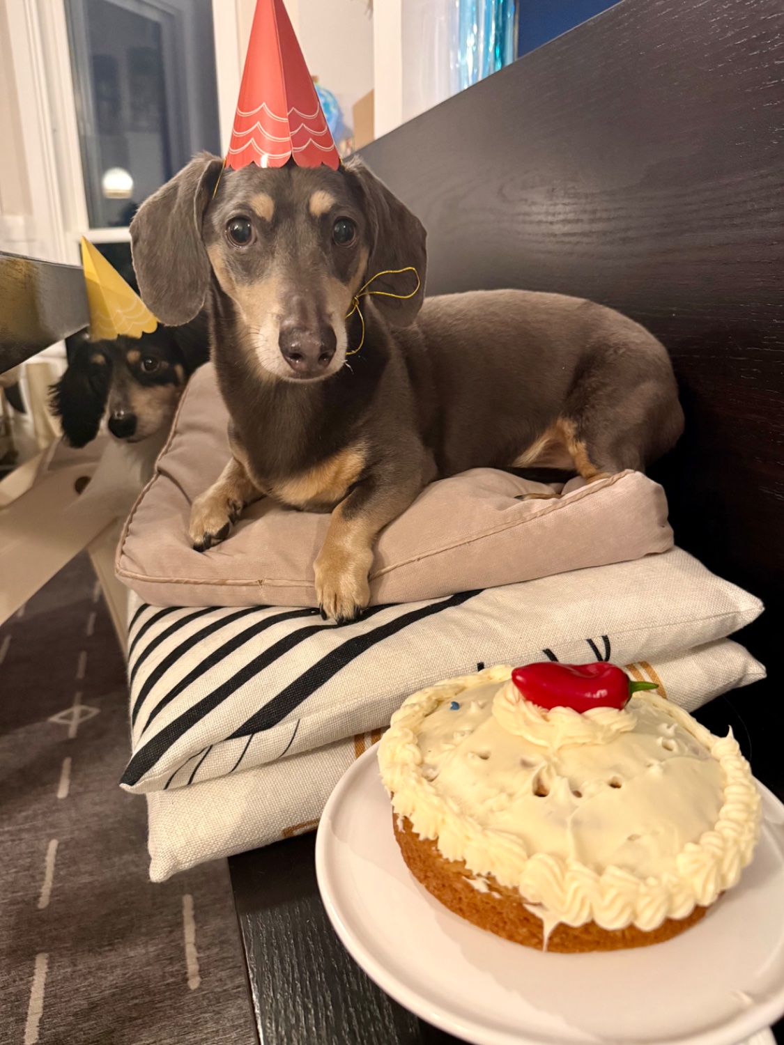 My dog hates to wear her birthday hat. Moop doesn’t seem to mind.
