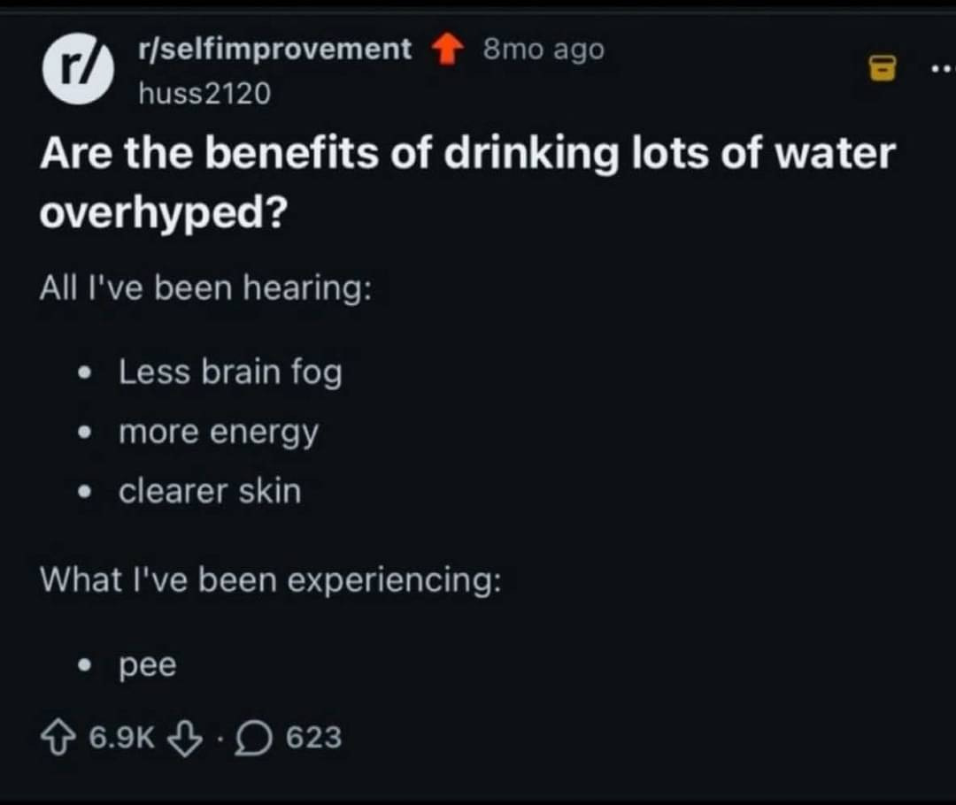 Me after drinking lots of water: depressed, but hydrated