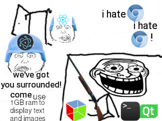 image description: “i hate the antichrist” meme, with the UN-soldier’s speech edited to say “we’ve got you surrounded! come use 1GB ram to display text and images”, and their helmets edited to show the electron and react logos. the troll character has a terminal logo, as well as the GTK+ and Qt logo with them, and is saying “i hate [chromium logo] i hate [chromium logo]!”