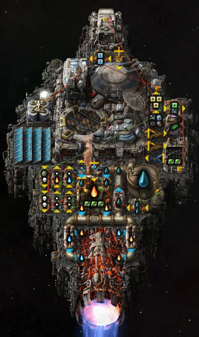 I’ve removed the self-sustaining ammo since it was just using up too many resources to be worth it for a small design. There were times where if it got low on ammo mid-flight it couldn’t keep the engines on long enough to make up for being pulled into a planet’s gravity due to the iron consumption. So I had to supplement it with ammo deliveries anyways, and I decided to just rely entirely on that. I also swapped out one of the solar panels for an accumulator and it seems to be working well.