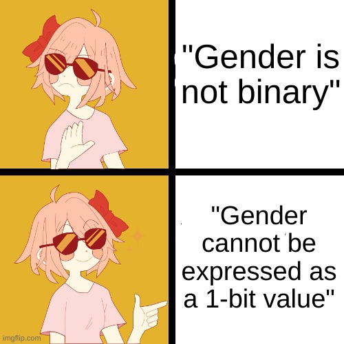 Valid and this is very certainly my math bias poking through. Though I think to consider the false case of a gender binary, the 1-bit value being M or F would suggest it’s describing the scope of gender expressions in memory values, and this interpretation seems to continue with the meme of it needing to be a 64-bit gender. So in correcting that falsehood, it would be a the space that have spots for all possible gender expressions.