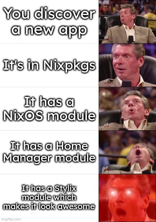 McMahon reaction meme depicting increasing satisfaction. Descriptions read as follows: