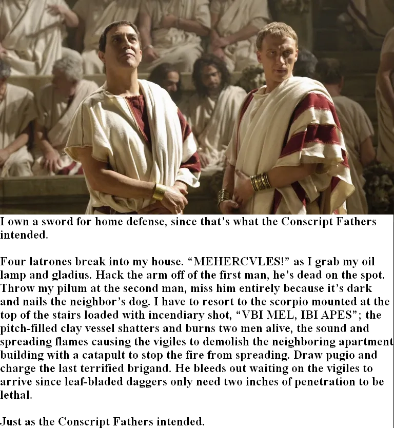 “Conscript Fathers” is another name for the Roman Senate, as the idea was that the Senate was comprised of men who were elderly (and thus the fathers in their household) and regardless of whether or not they willed it. In theory. In practice, becoming a Senator was pretty highly desired, but the Romans did love their false modesty regarding power. “No, no, I couldn’t POSSIBLY accept a position of authority… unless… you were to insist… 👉👈🥺”