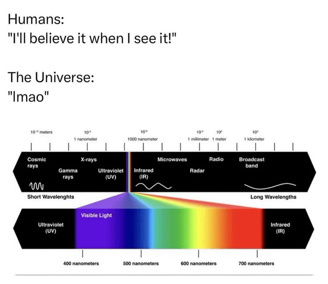 Umm… Is the joke that what we see is actually a very small part of EM spectrum and things that we’re unable to see is the vast majority? Or just that “haha rainbow gay”?