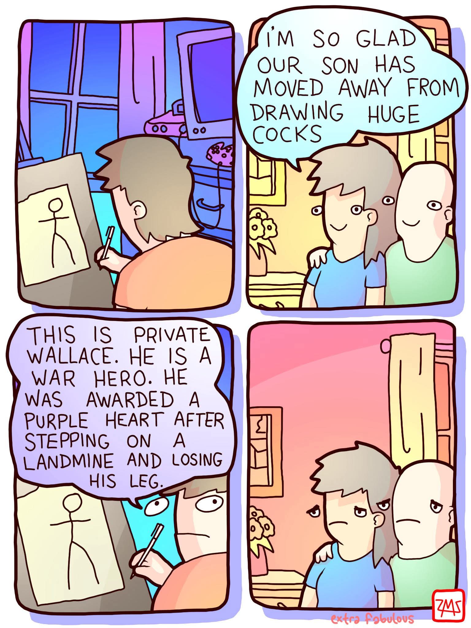 I choose to believe Private Wallace blew off his massive cock, rather than his huge member hanging while he balances on one leg.
