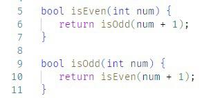 boolean isOdd(int num) { if(num == 1) return true; if(num > 0) return isEven(num - 1); else return isEven(num + 1); } boolean isEven(int num) { if(num > 0) return isOdd(num - 1); else return isOdd(num + 1); }