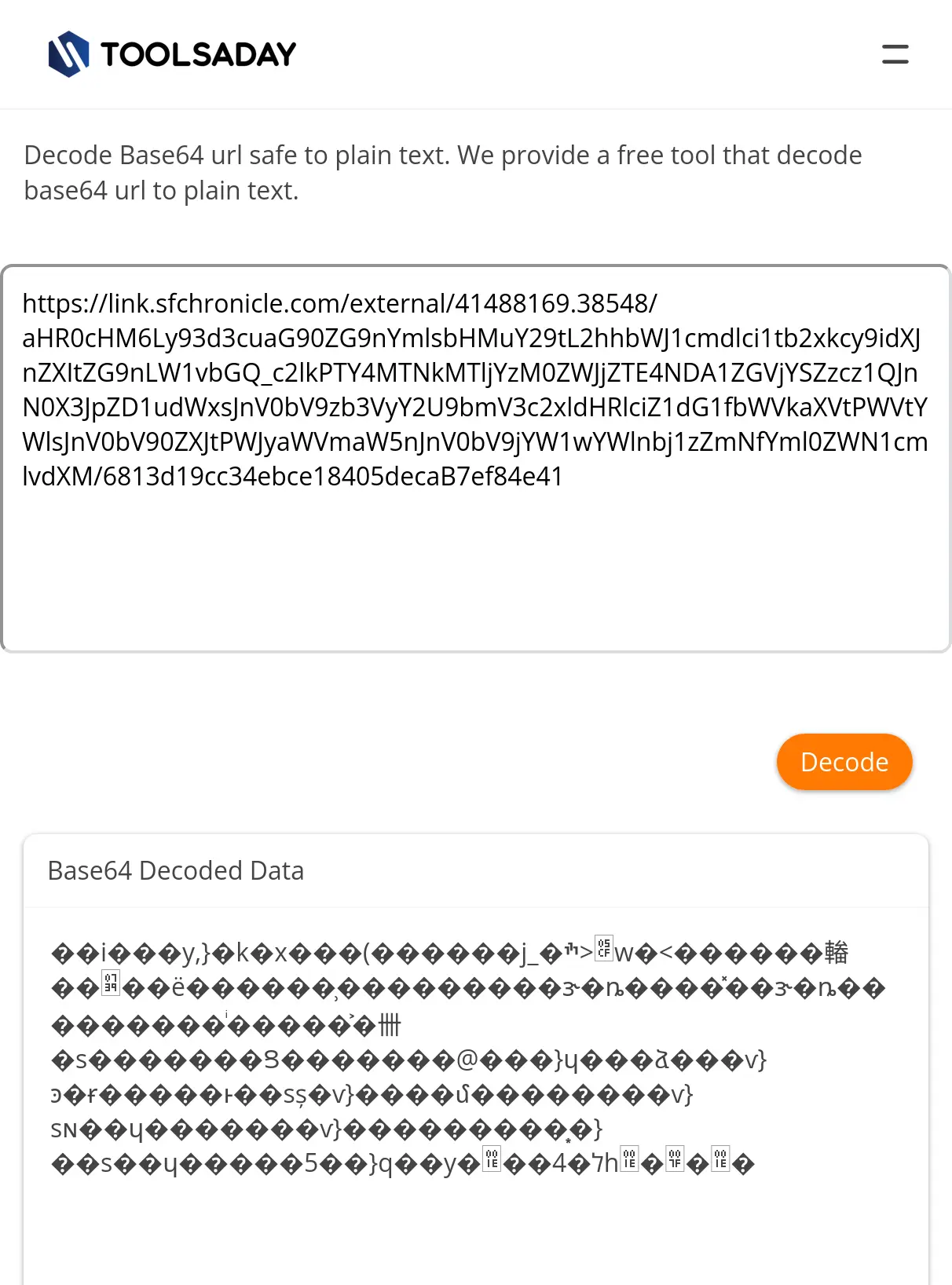 Edit 2: See if your solution will decode this link (the one in the image): https://link.sfchronicle.com/external/41488169.38548/aHR0cHM6Ly93d3cuaG90ZG9nYmlsbHMuY29tL2hhbWJ1cmdlci1tb2xkcy9idXJnZXItZG9nLW1vbGQ_c2lkPTY4MTNkMTljYzM0ZWJjZTE4NDA1ZGVjYSZzcz1QJnN0X3JpZD1udWxsJnV0bV9zb3VyY2U9bmV3c2xldHRlciZ1dG1fbWVkaXVtPWVtYWlsJnV0bV90ZXJtPWJyaWVmaW5nJnV0bV9jYW1wYWlnbj1zZmNfYml0ZWN1cmlvdXM/6813d19cc34ebce18405decaB7ef84e41 (it should decode to this page: https://www.hotdogbills.com/hamburger-molds)