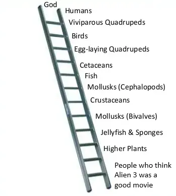 I’m going to nitpick even harder - Who says it’s a ladder depicting evolution? Maybe this framing subconsciously slipped into your way of thinking? It could be a ladder depicting of how the author regards creatures in terms of moral ability or even price per pound of entity. I’ll go one further, the inclusion of “God” on the ladder indicates that it’s not an evolutionary ladder.