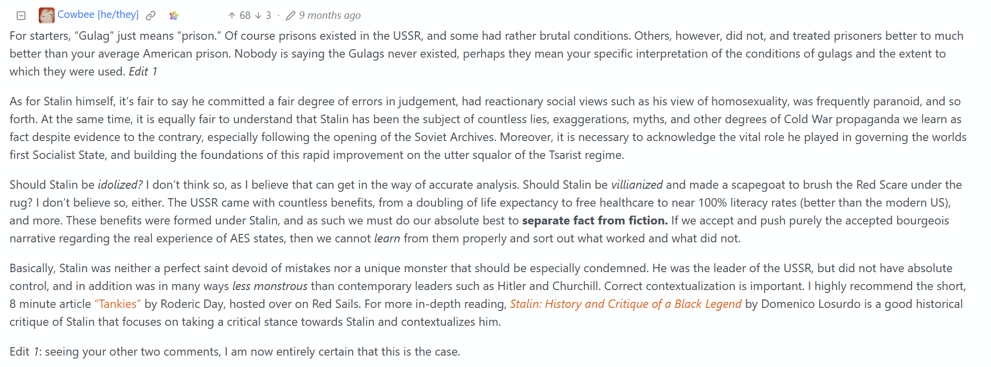 It kinda drives me nuts, as I really enjoy cowbee’s style of posting. He seems to put a ton of effort into his posts, presents things in a well composed, rational way, and often provides sources. Even in rebuttals, I haven’t noticed him get angry, just tries to further contextualize his point. He’ll come into threads of people asking for advice on political things and just calmly provide a huge list of texts and books on forming political movements and developing ideology. It’s all stuff that I’d normally love.