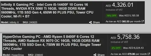 In terms of performance between the two, i’d actually expect the intel to be a marginally faster cpu and have better connectivity (AMD’s 8000 series is a bit weird compared to their 7000 or 9000 series options, and lack some pcie lanes compared to a standard gaming cpu). This isn’t a super relevant difference for gaming, but still worth knowing for comparing the computers. On the GPU front, which is the most important part for games, the 9070 is way better and this is probably where the price difference comes from. I’d expect the amd system to be noticeably better for gaming, though honestly the price to performance between the two computers probably tracks pretty well.