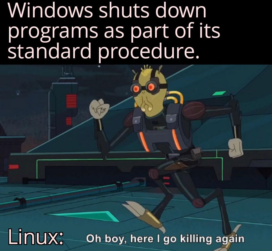 minus-squareалсааас [she/they]@lemmy.dbzer0.comlinkfedilinkarrow-up3·16 days agoThat would depend on the DE I suppose, on GNOME it’ll show open programmes and wait 60 seconds for the user to intervene IIRC. Still doesn’t kill them though and asks them to properly terminate themselves which allows them to take care of everything.