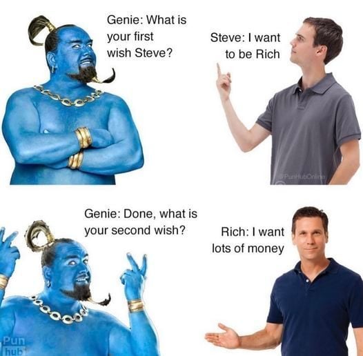 minus-squareerrer@lemmy.worldlinkfedilinkEnglisharrow-up12·1 month ago“I wish you could give me a lot of money?” “Done. I now could give you a lot of money…”