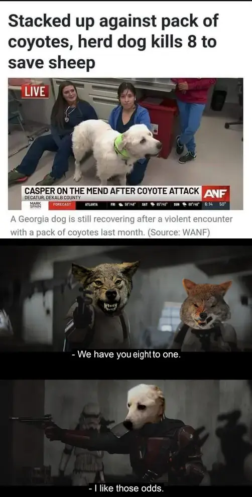 Those coyotes didn’t expect to meet the Good Boi of DeKalb, Woofer of Woe, the Hound Who Watches the Herd. Legends says no coyote can kill him and he can lift three sheep in his mouth