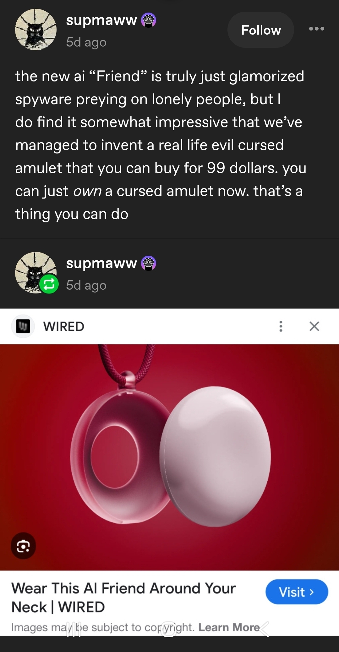 Actually, yeah. Y’know some of those cursed things could have just been “smart wear” or smth. A mysterious object that whispers lunacy and drives the holder into madness? Yeah, a “ai” necklace will do that.