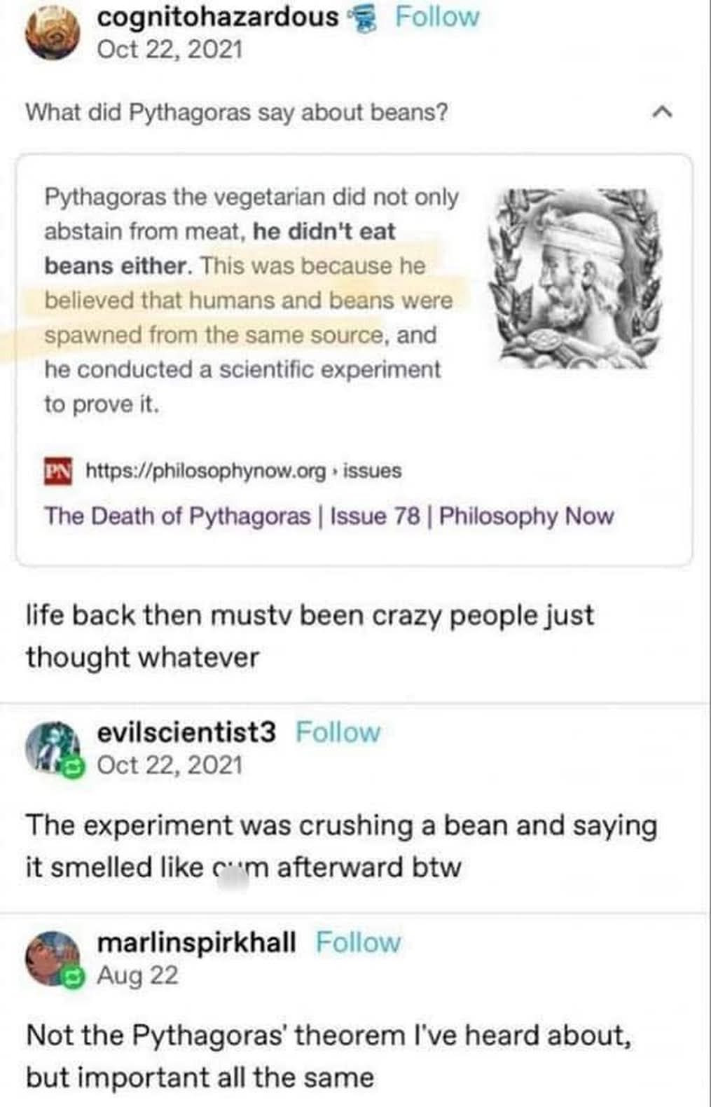 Huh, I was watching a YouTube video about the Sabians in Türkiye the other day and how they were Pythagorians who didn’t eat beans