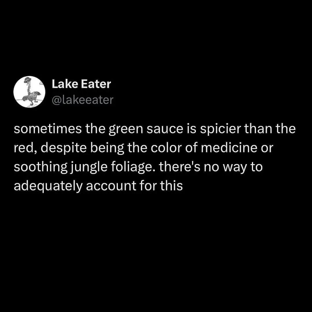 Green sauces are made with tomatillos/green peppers/etc. and has a more vegetal flavor, while red sauces are made with tomatoes/red peppers/etc. andtastes like tomatoes, roasted red peppers, and the like. Spice level is irrelevant. Put more simply, the green sauces taste “green” and the red sauces taste “red”; and are better on different things. The good ones are hot as hell regardless of color.