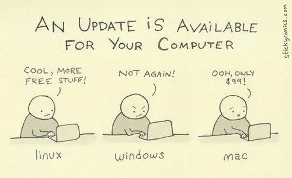 This whole thing seems inaccurate. I literally never get even remotely excited about a Linux update, it’s always boring stuff that means nothing to me. I don’t Windows updates because I feel like it delivers them in a big lump and lets me install as I shutdown, which is easy. Apple hasn’t charged for updates in well over a decade.