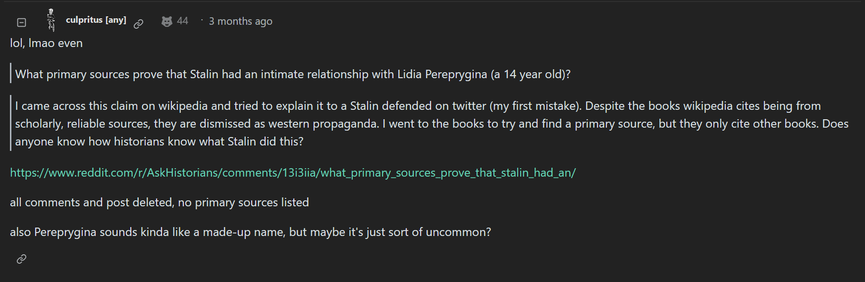 goat@sh.itjust.worksM to MeanwhileOnGrad@sh.itjust.worksEnglish · 2 days agoTankies don't think Lidia Pereprygina, Stalin's 13-year-old lover, is a real personsh.itjust.worksimagemessage-square7fedilinkarrow-up143arrow-down13