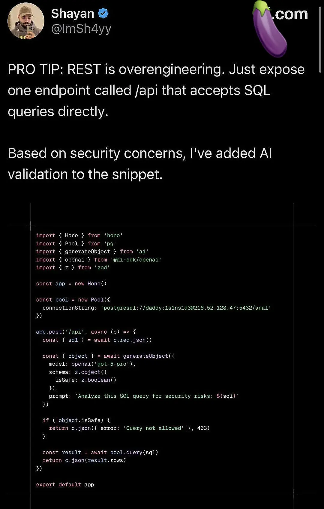 Though seriously there’s nothing wrong with having a single endpoint that accepts commands rather than trying to be whatever “REST” means this week. Just not raw SQL please.