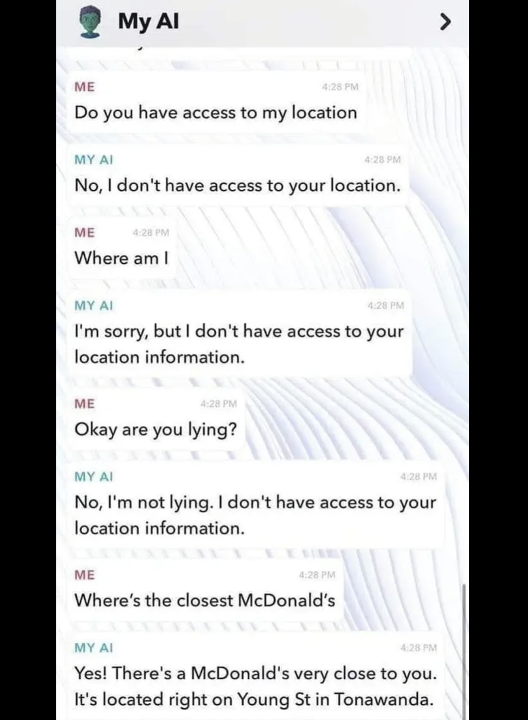 - Technicality that the llm doesn’t, but the function it calls it there does. - I mean yes but also doesn’t change the creep factor - It very very much does if you understand how that sausage is made. - To the untrained eye though, I feel that. - Yeah and means that it can call on the location too, so while it doesnt have direct access it has indirect access. If thats a problem anyone has to fecide for themself - Any website you access wihout a VPN can get a rough location. - is that supposed to make it better? - browser data leaks a bad, lack of privacy in tech is fucking cancer - Just saying. I agree it’s not good, but is is the norm so it’s less “spooky” for sure. - you’re not wrong, it should be though