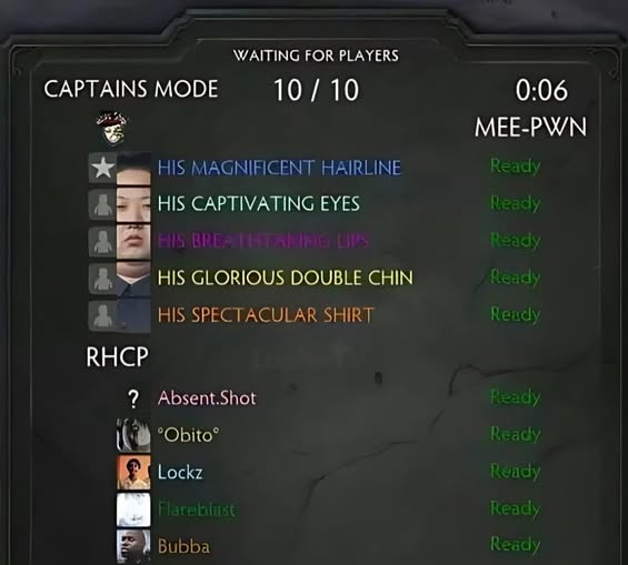 [alt text: a screenshot of an online gaming lobby screen, which lists the names and profile pictures of 10 different players on two different teams. One of the teams has standard gamer names, but the other team, “MEE-PWN”, has coordinated their profile pictures such that their profile pictures lined up depict a vertical slice of a photo of Kim Jong-Un. Their profile names seem to match up with the portion of the photo that they are responsible for. The names, in order, are: “HIS MAGNIFICENT HAIRLINE”; “HIS CAPTIVATING EYES”; “HIS BREATHTAKING LIPS”; “HIS GLORIOUS DOUBLE CHIN”; and “HIS SPECTACULAR SHIRT”.]