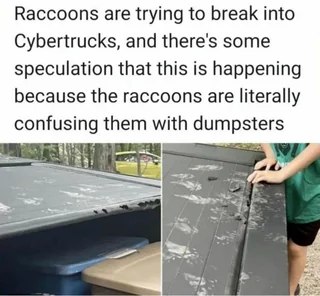 What I see is Raccons have finally found a use for Cybertrucks we could use more dumpster for proper trash disposal.