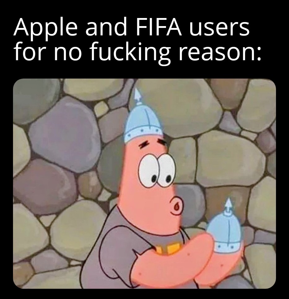 minus-squarerustydrd@sh.itjust.workslinkfedilinkarrow-up12·8 days agoOh, FIFA the game. Thank you, I was like “how do you use FIFA?”.