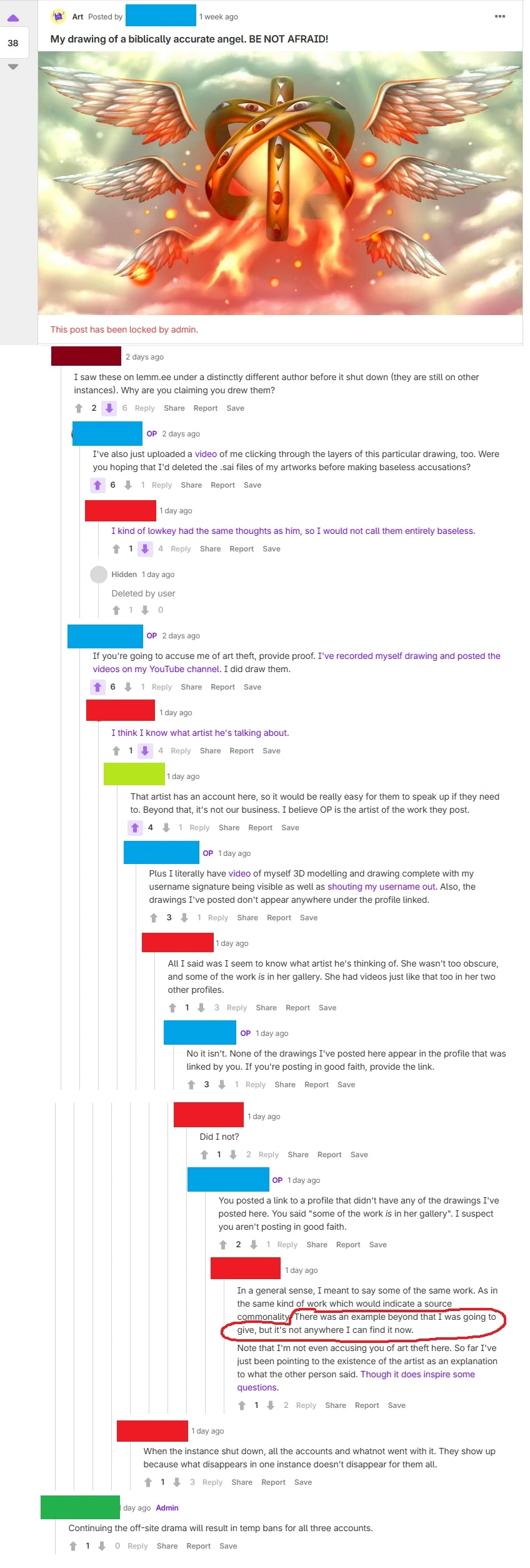 For context the person in red (dark red is their sock account) was boasting about mass reporting the artist for art theft on their blog to get them banned from all the sites they’re posting art on so the “I’m not accusing you of art theft” is a lie and they’re trying to keep their trolling civil so it doesn’t get removed