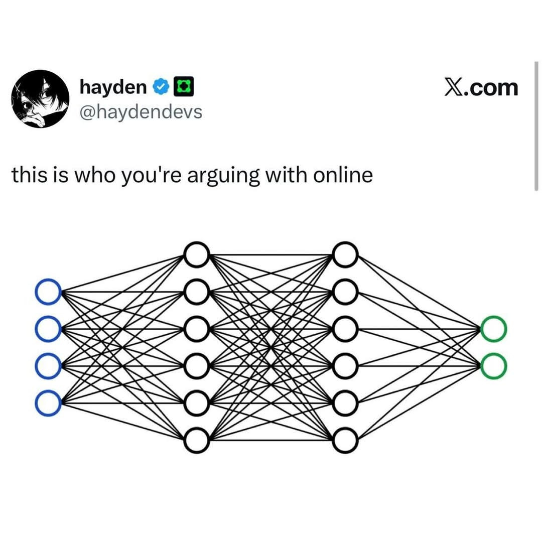 Yeah, if you’re supposedly in AI/ML and don’t recognize a (stupidly simplified) diagram for a Neural Network, you don’t really make stuff with it, you’re just another user (probably a “prompt engineer”).