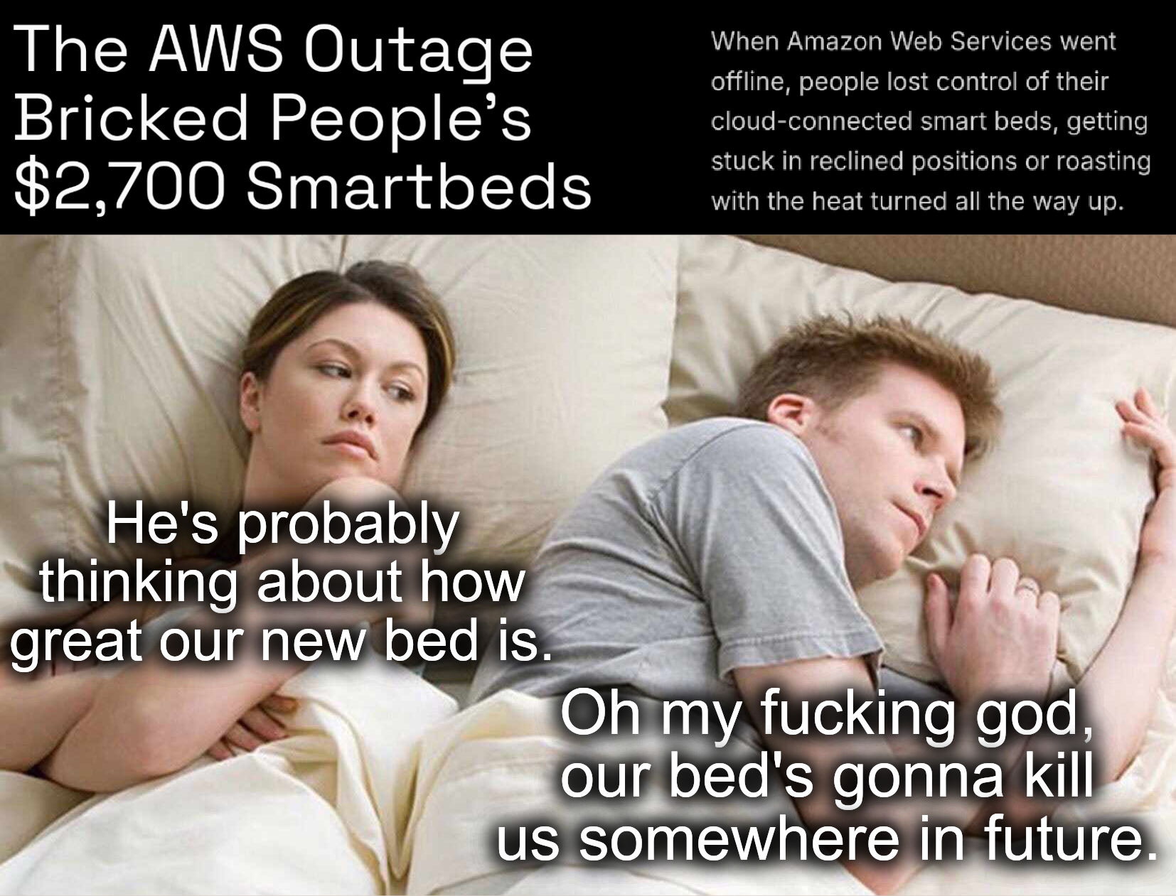 Petersson@feddit.org to memes@lemmy.world · 1 month agoSmart bed? Really?feddit.orgimagemessage-square12fedilinkarrow-up1190arrow-down13