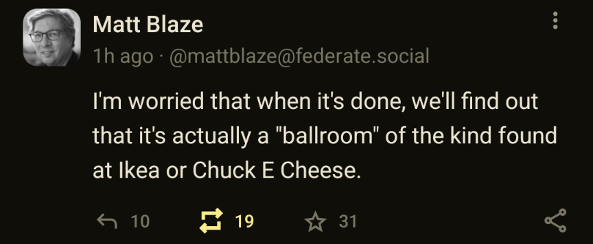 And he keeps talking about the ballroom. Trump only remembers the last conversation he had, so someone is pointing him at the ballroom for some reason. We saw it when Kirk was shot… When asked for comment he said it was terrible and then launched into another speech about the ballroom