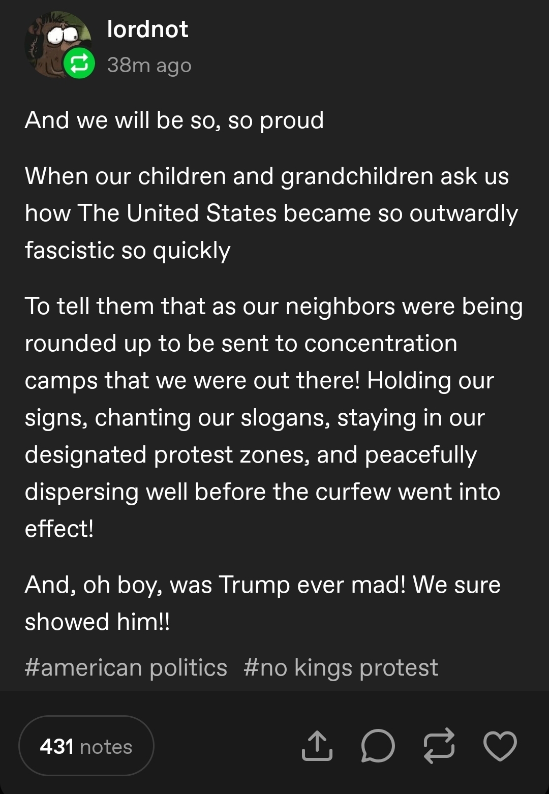 Hey man i go to the protests too, it would just be nice to actually use numbers to make progress instead of listening to old white people tell us how good we are for protesting in a way that won’t bother anyone or impede anything