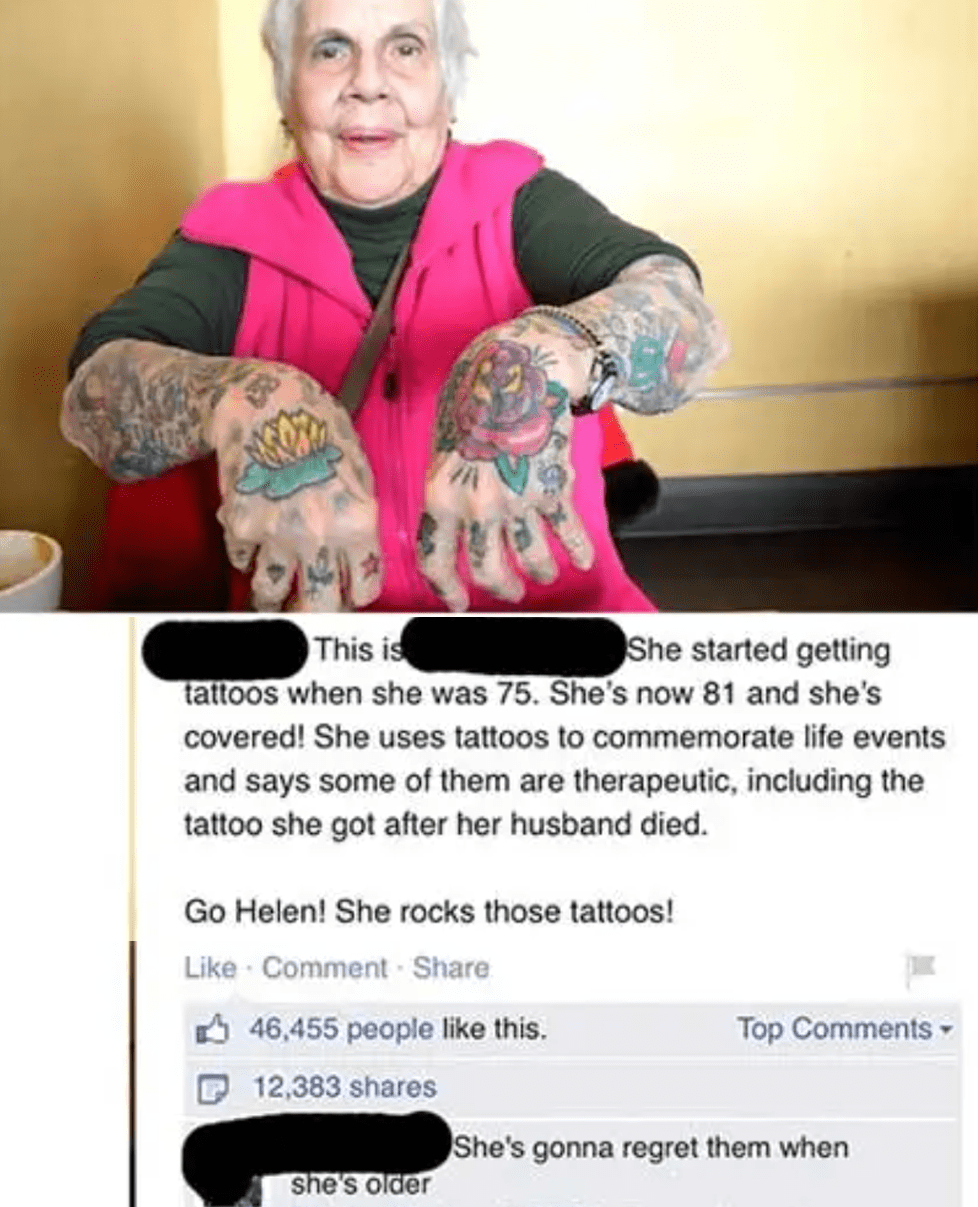 My mother who is 65 started getting tattoos when she turned 50 and now has 38 of them I think. Including hands and face.