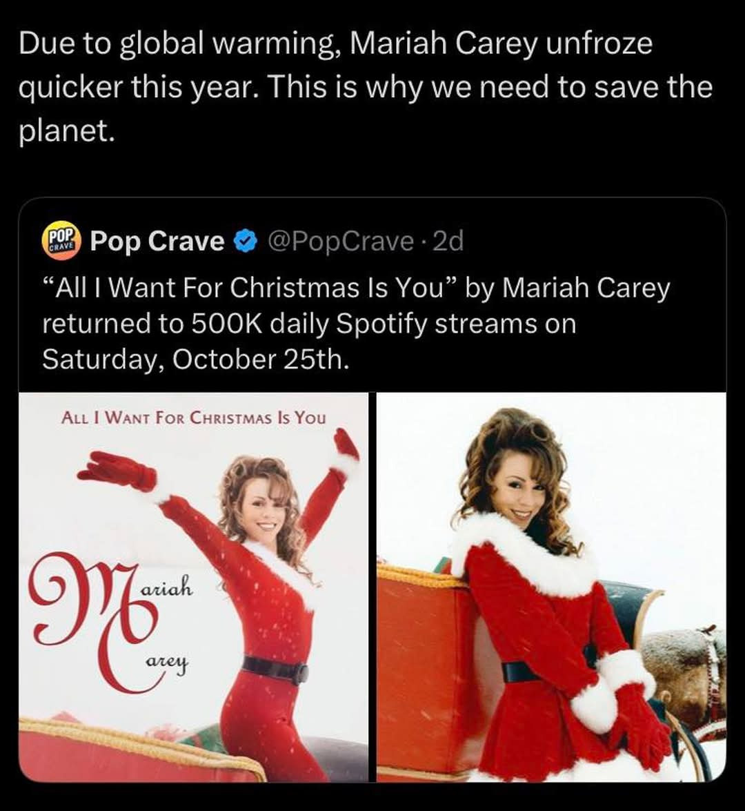I’m not ruling out that a few hundred thousand completely random people around the world all decide to listen to Xmas music around the same time. I just think it’s more likely businesses switching to seasonal music as early as possible, and streaming Mariah Carey 20 times a day, causing the big sudden spike.
