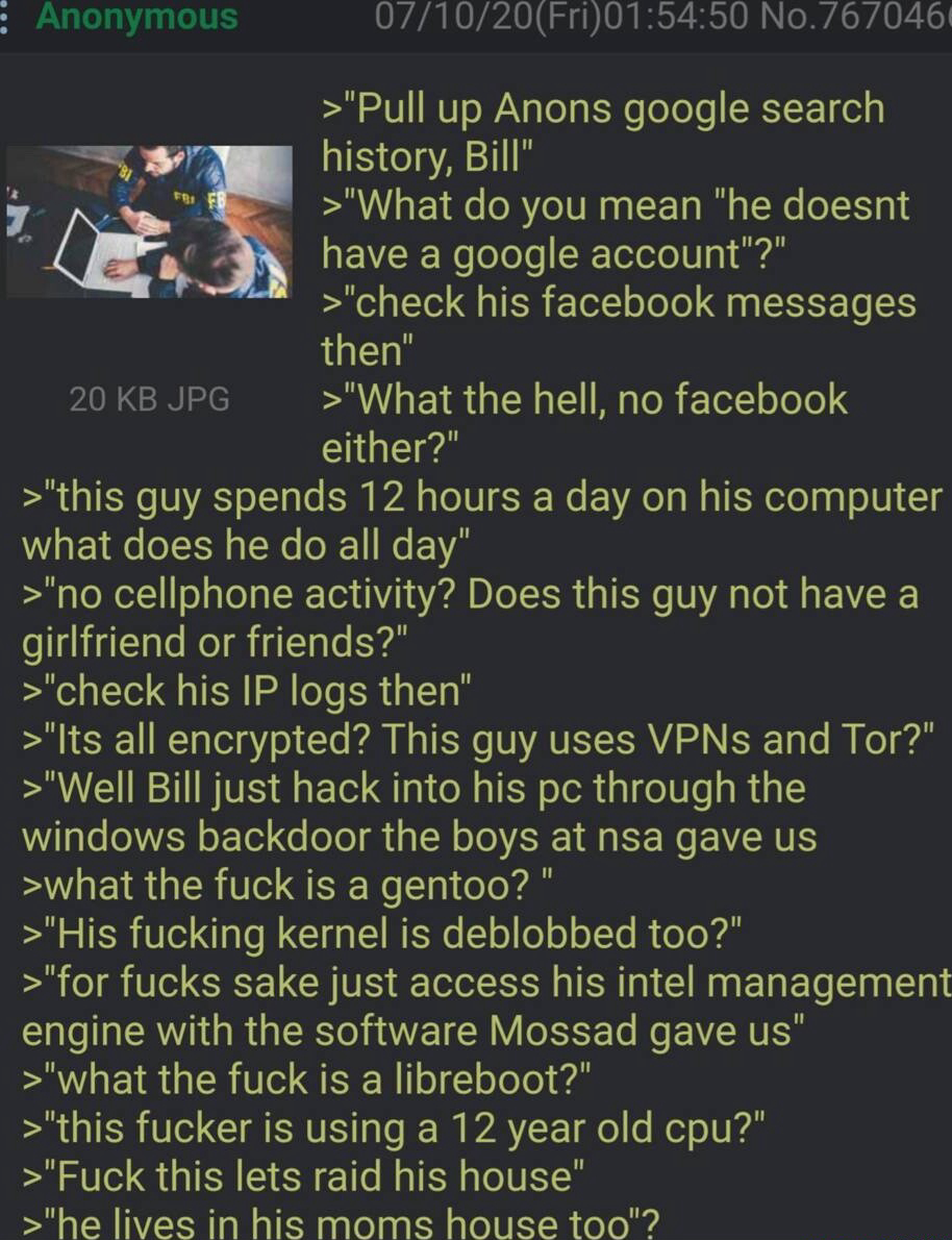 Presuming that Mossad can be topped with a subscription to ProtonVPN or a Tor browser is adorable. Hell, presuming nobody in the intelligence services is familiar with Linux is even more adorable. “We’ve got everyone at the NSA fooled because we’re Arch users”. Yeah, sure buddy. What do you think these professional computer nerds are doing in their own free time?