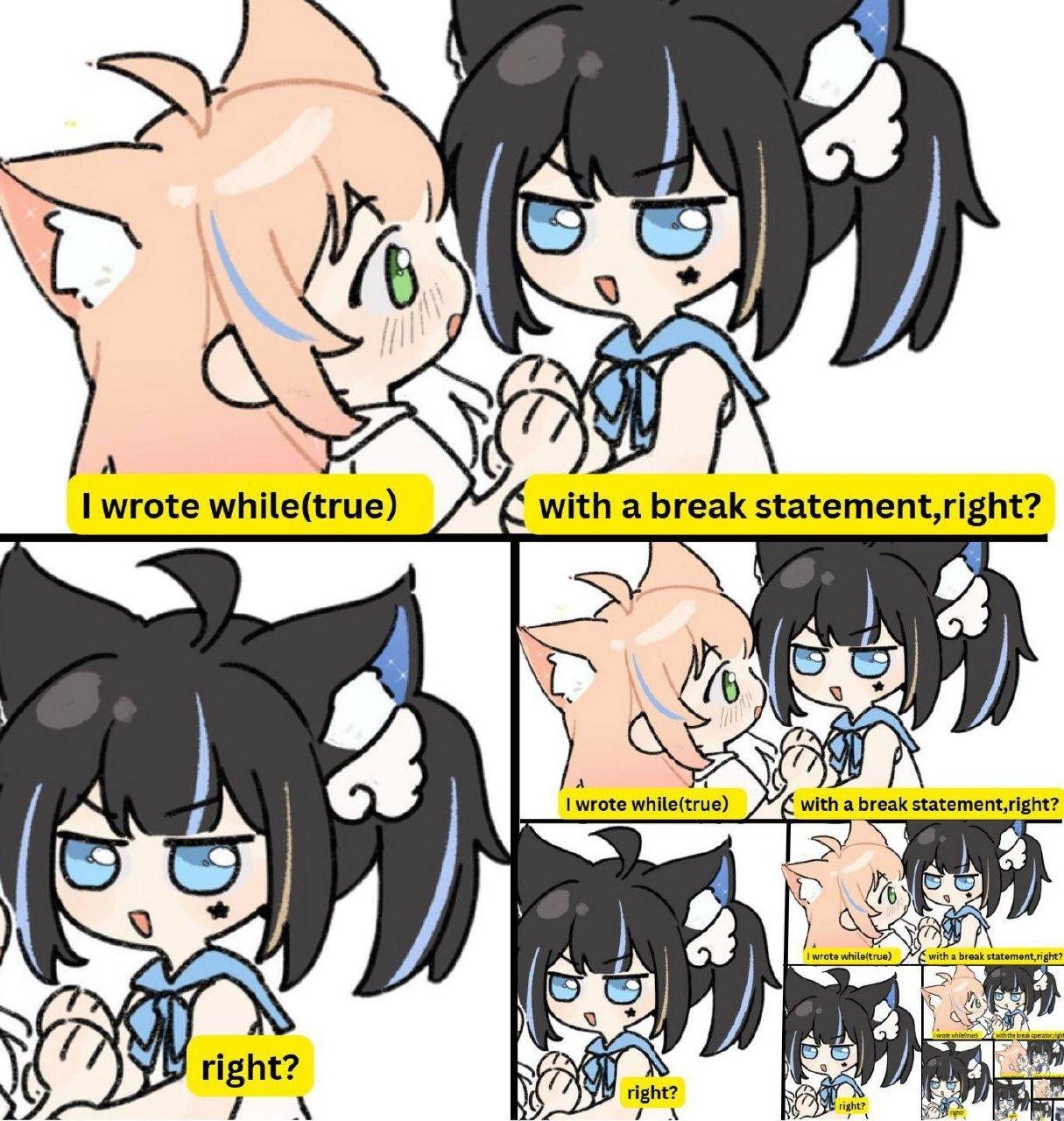 break… when I was young we had abreak, it’s calledSIGKILL. And we liked it this way!Sometimes break is undesirable. But if you want an infinite loop, please please please include a sleep. Not doing this is why my CPU stays at 100%.