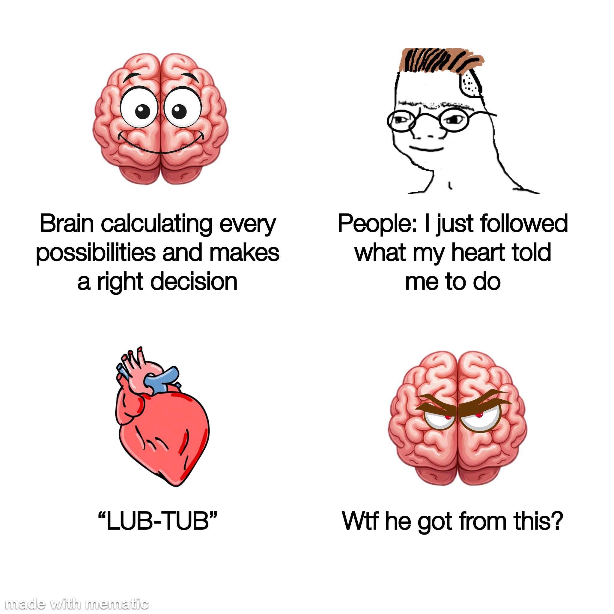 It beats faster during excitement. “heart go brrr here, then I go here”