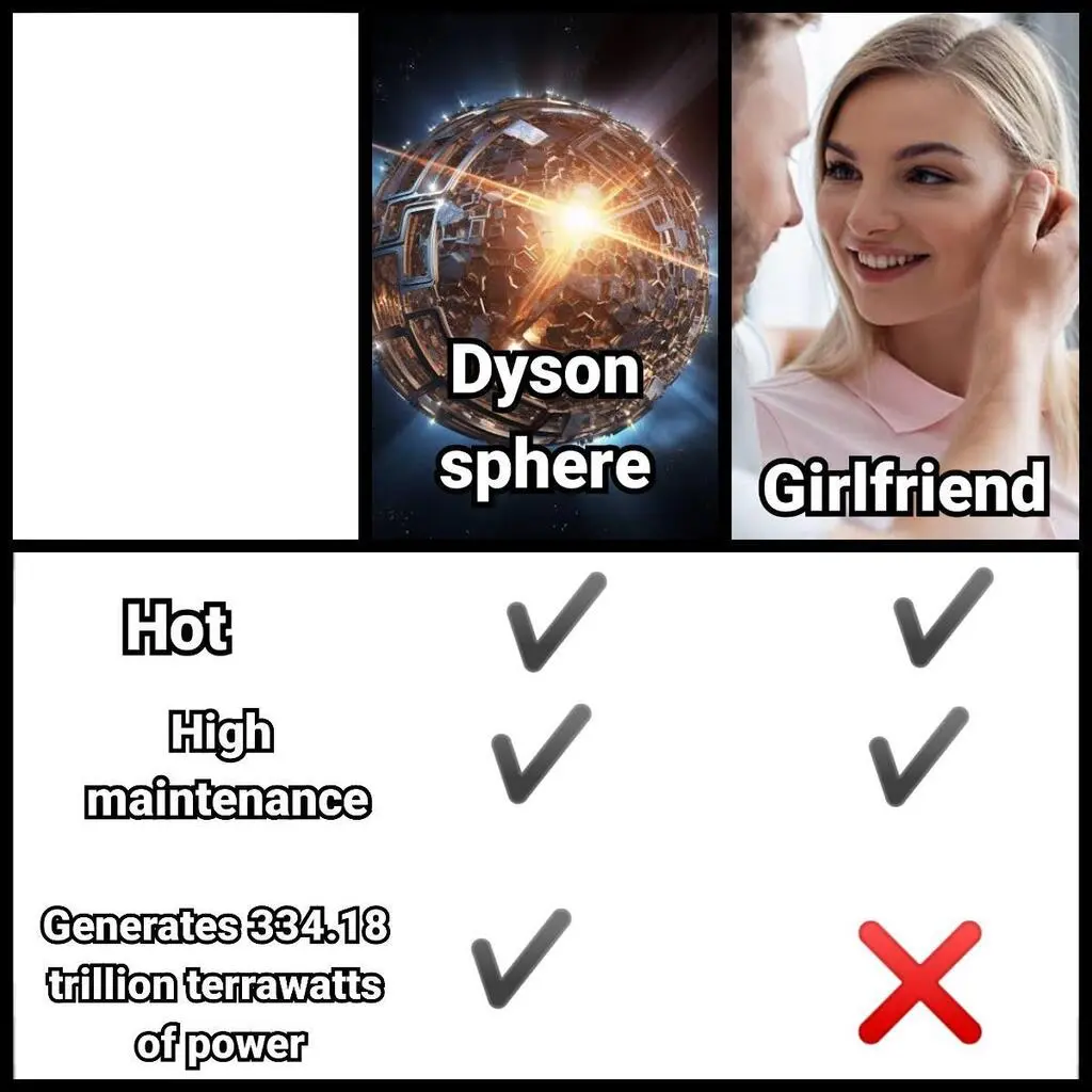 Edit: though I don’t think a Dyson sphere exists either, so we’re making a lot of assumptions here.